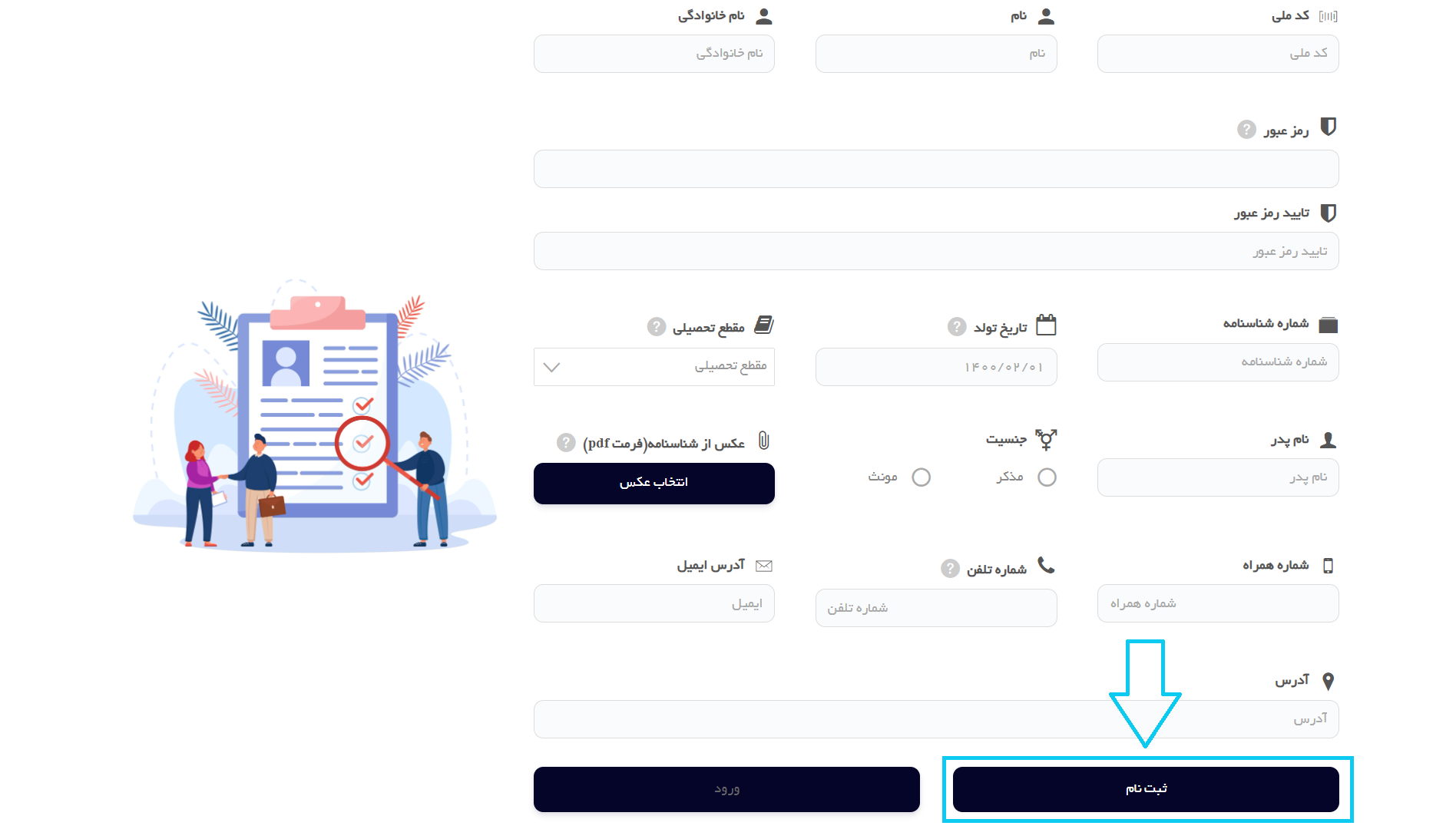 ابتدا باید از بخش پیش ثبت نام که در صفحه اصلی قرار دارد در سایت عضو شوید.(در صورت داشتن حساب کاربری از دکمه ورود استفاده کنید)
