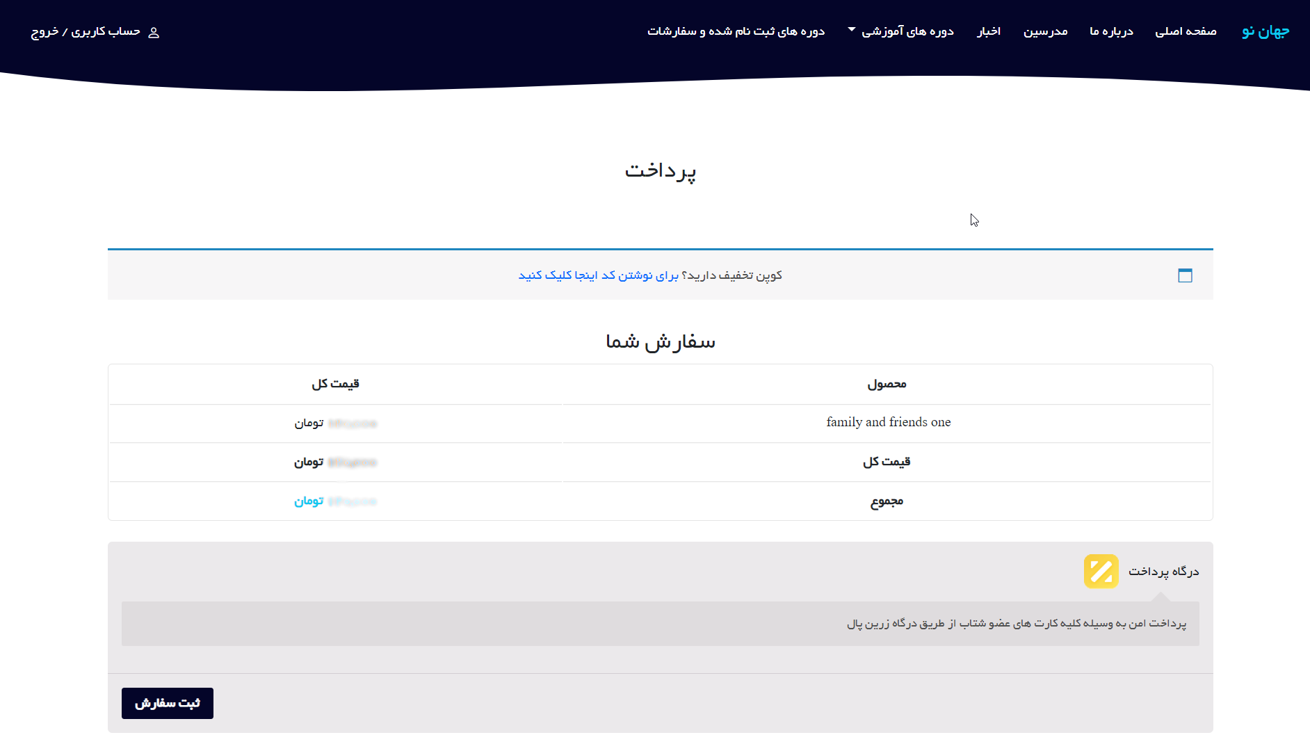 حالا وارد سبد پرداخت می شوید.در این قسمت می توانید هزینه نهایی را با جزییات ببینید و با زدن ثبت سفارش به درگاه پرداخت بانکی هدایت شوید.